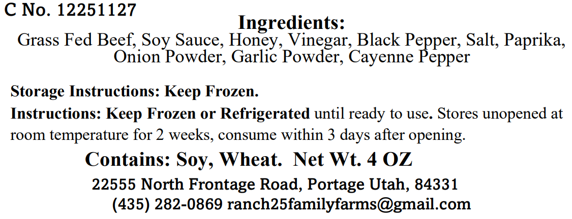 Ingredients: Grass Fed Beef, Soy Sauce, Honey, Vinegar, Black Pepper, Salt, Paprika, Onion Powder, Garlic Powder, Cayenne Pepper